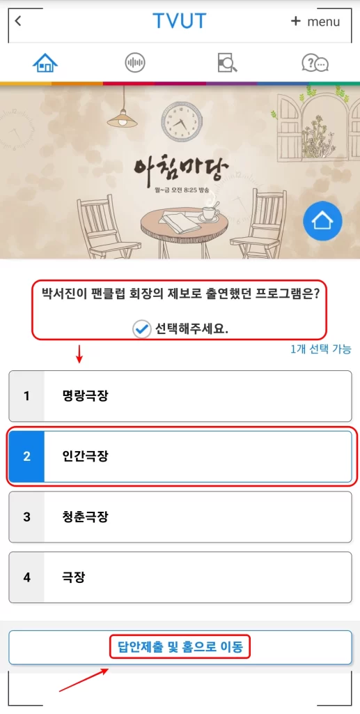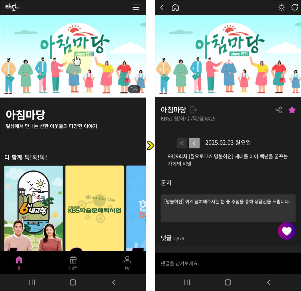 - 티벗 앱 실행 → 아침마당 배너 클릭