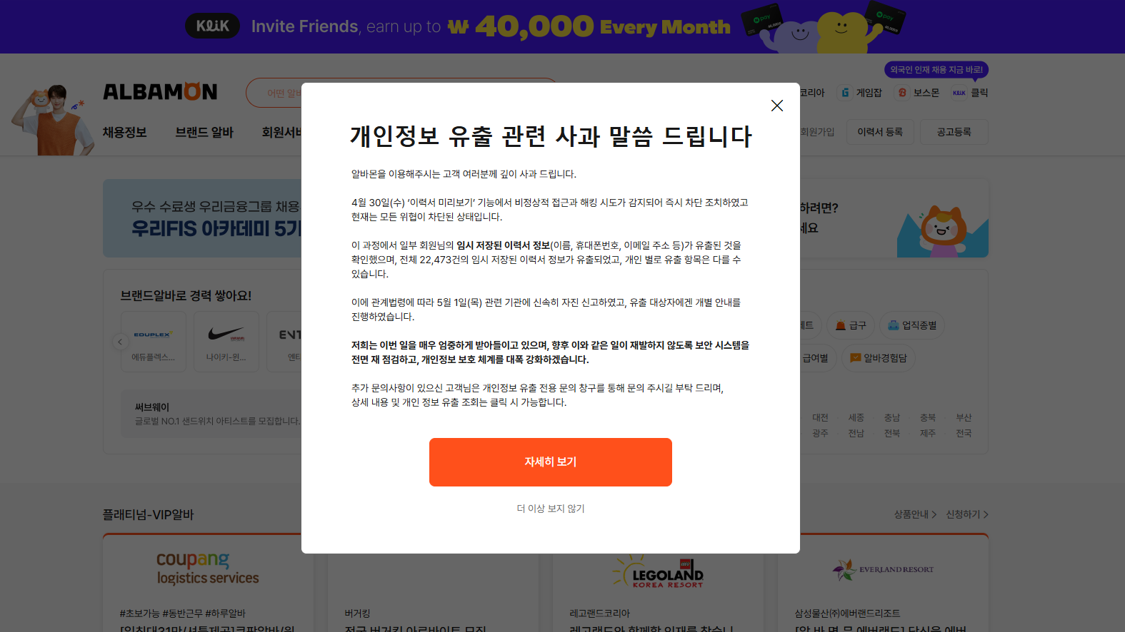 - 보안 대응: 알바몬은 해킹 IP를 즉시 차단하고, 개인정보보호위원회에 자진 신고