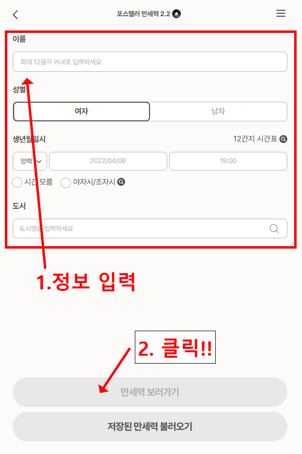 - '만세력 보기' 페이지가 열리면 다음 항목을 입력해 주세요: