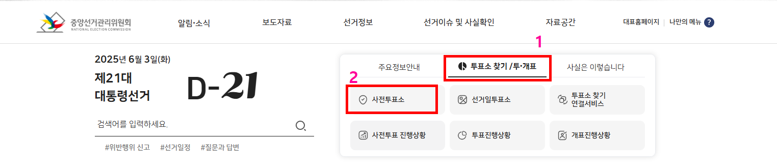 홈페이지 메인 화면에서 '사전투표소 찾기' 또는 **'선거정보' > '투표소 안내'**를 클릭합니다.